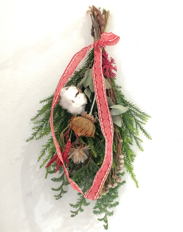 クリスマスに飾るスワッグ。せっかく作ったのですからお正月まで楽しめるようオーナメントをセットにした教室を開催しております。
