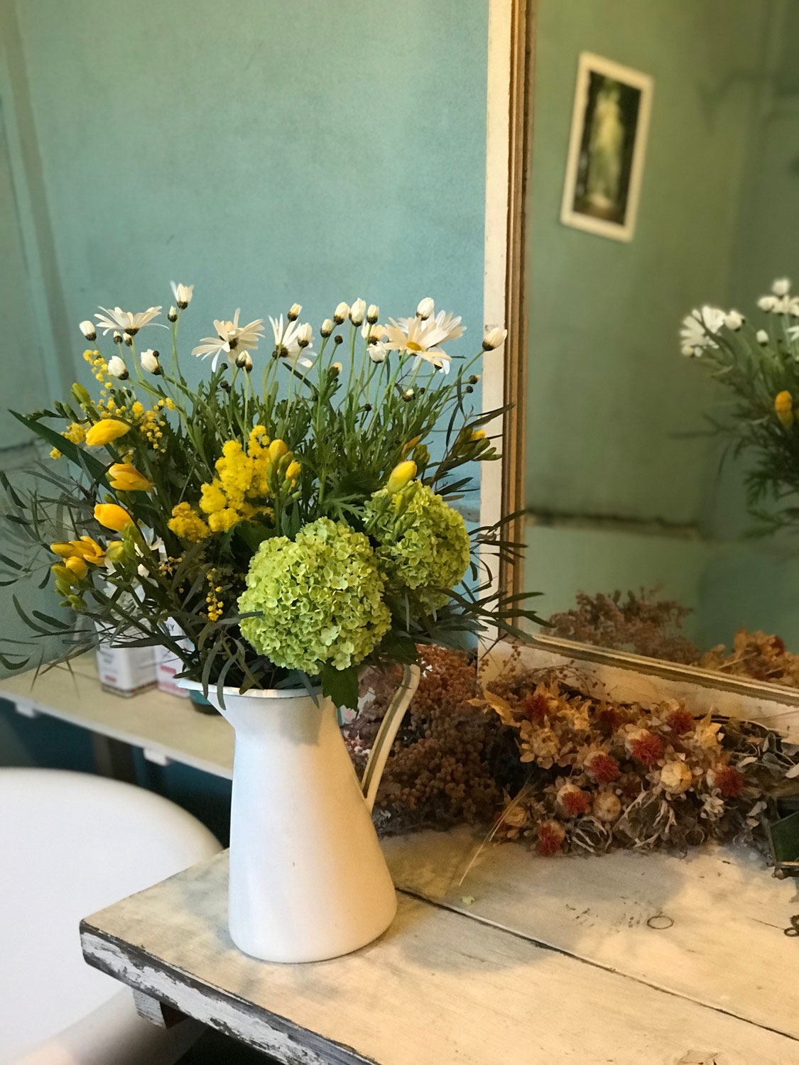 当花店ではギフト、冠婚葬祭用途に加えて例えば個展やイベント会場の装花なども承っております。今回は鎌倉の個展会場となったレストランでの装飾です。