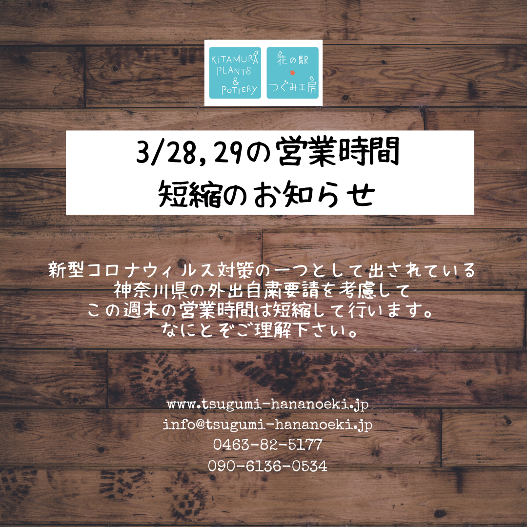外出自粛要請を考慮して、この週末の営業時間は短縮して行います。よろしくお願いします。
