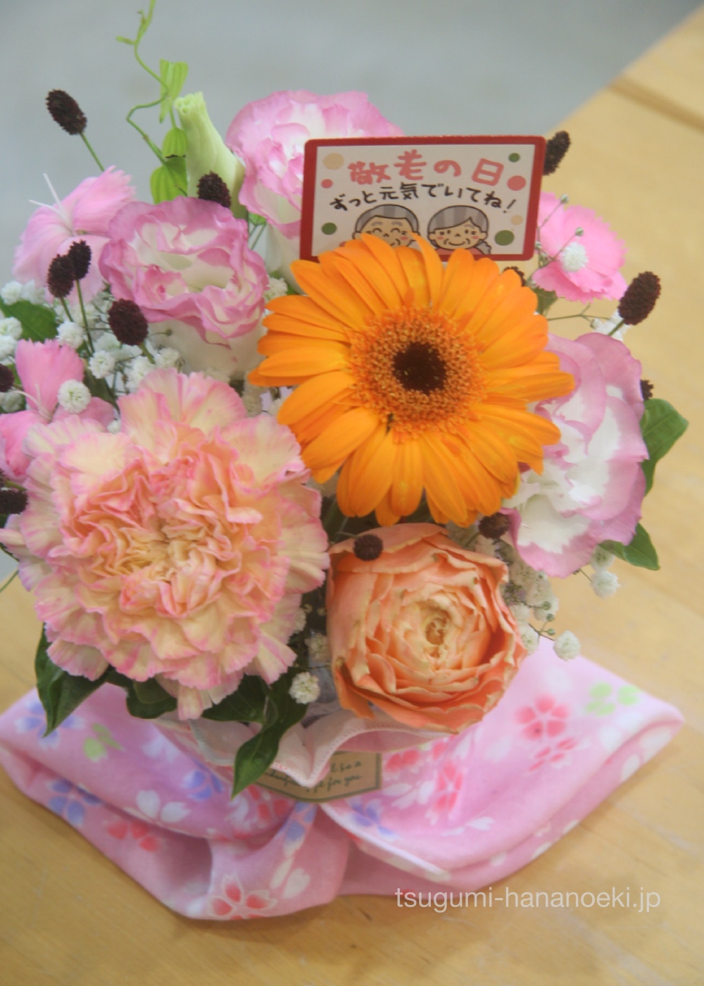 9月17日は敬老の日ですね。お花で気持ちを伝えるプチギフトとして、敬老の日限定フラワーアレンジメントを販売します。この機会にぜひお問い合わせ、ご予約くださいませ。