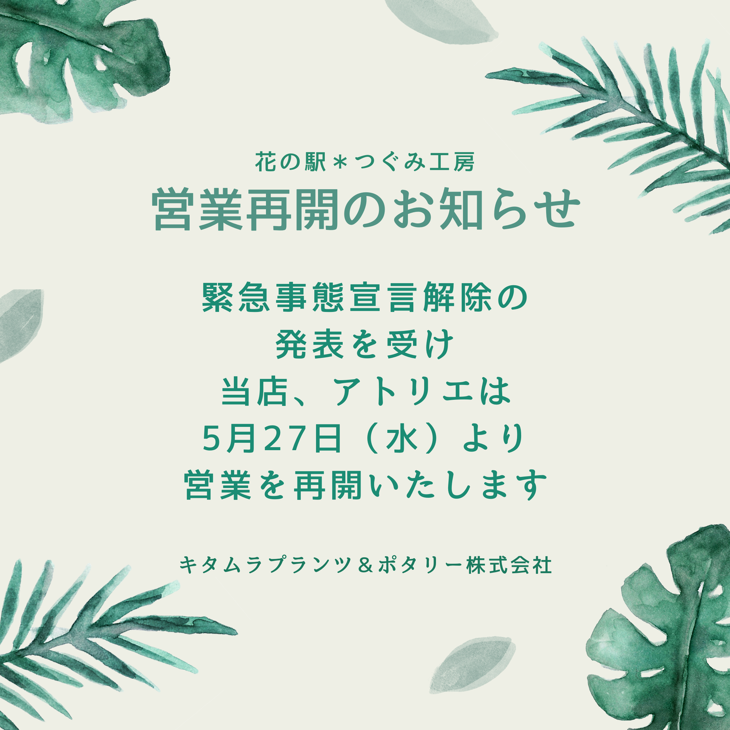 本日、5/27より花店・アトリエの営業を再開致します。再感染拡大防止策を取りながら対応をしてまいりますのでよろしくお願い致します。